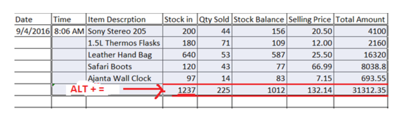 Usually if you want to find the sum of values in a spreadsheet you have to highlight the cell where the sum would go, then click auto sum and finish by hitting the ENTER key. This takes a hell lot of time only to find the sum to one column. With large data, you need a faster and friendlier way to do the sum.